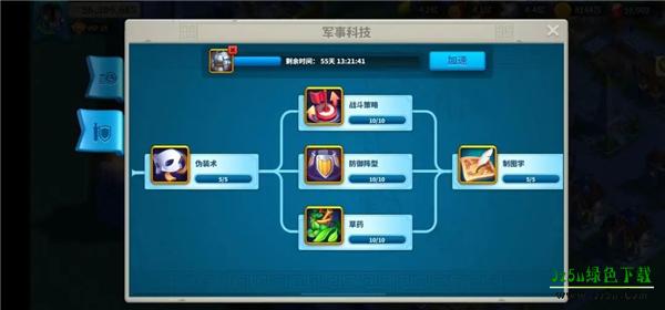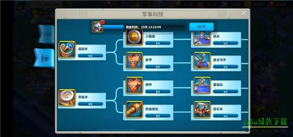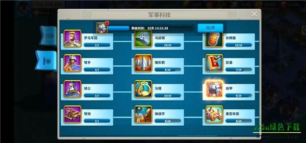 中期科技:这里的科技就是T4兵种研究的前置科技,当然他们不用需要全部研究满就可以研究T4了。但是因为中间三项科技都是十等级,所以需要很长时间,这三项的等级十部分每项拿到符文按满帮助都需要一百天左右,我们称之为小三元,等级十部分的研究一般等到中后期进行。