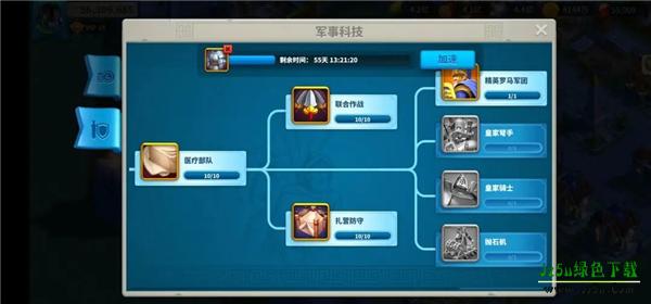 后期科技:这也是我的科技图,因为我玩步兵,所以我只解锁了步兵T5。这里的三项科技我们称之为***,同样等级十的研究加速超过百天。等到后期攒够加速再进行解锁。