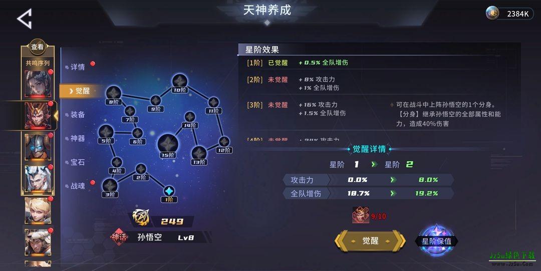 在游戏中,每次获取同一个天神的时候,将会转变为该天神的碎片,它能够帮助天神进行觉醒的养成。觉醒不仅提升天神的伤害,也可以提供巨量的全局伤害加成。