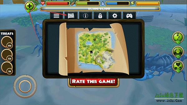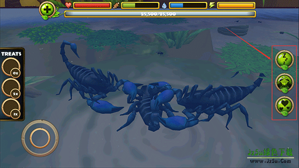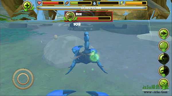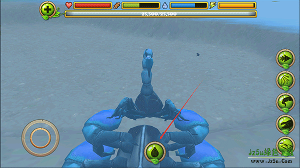 3、在探索的途中你可以攻击别的动物,如蜻蜓、鸟、蛇、青蛙等待,右侧按按钮由上至下分别是加速、眩晕、尾刺攻击、钳子攻击,吃;