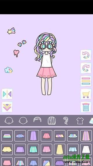 2、进入到游戏中,我们可以看到彩虹色的封面,十分梦幻,游戏中有数十种表情可以选择,还可以分别选择刘海和发型,大多都是十分可爱的七彩色,可以根据心情随意搭配,还有各式各样的上衣和连衣裙,更有各种各样的外套可以让你的人物有各种各样的动作,我们还可以选择样式各异的装饰物装饰你的画面,还有可爱的对话气泡和字母,可以让每一个人物都有不一样的感觉。