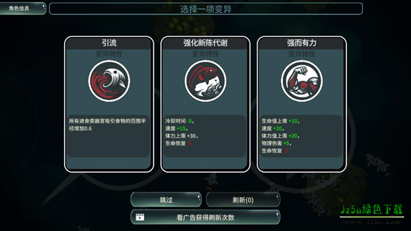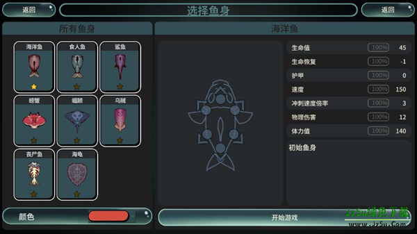 2、开始游戏前需要选择喜欢的鱼身,鱼身的属性各不相同