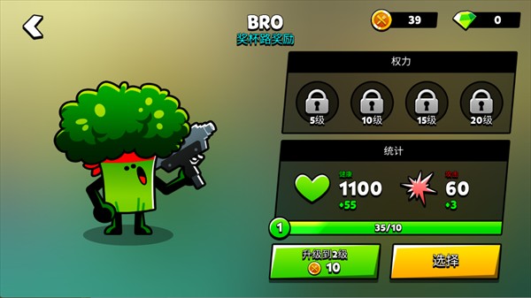 消耗金币升级西兰花战士,提升健康值与攻击力,解锁等级特权强化战力。