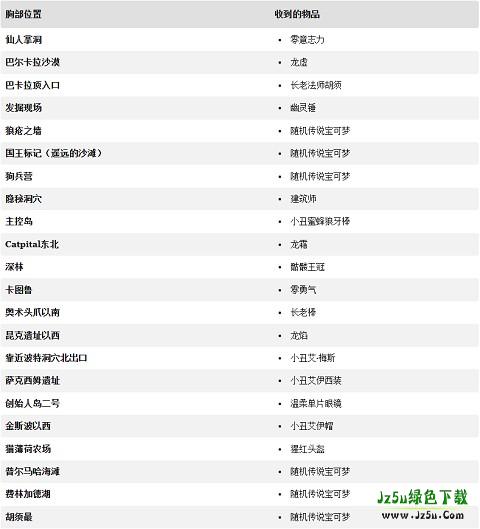 费林加德有15个黄金宝箱,卢普斯帝国有7个金宝箱,其中6个是传奇宝箱,会生成九个传奇物品中的一个,所有物品的生成概率相等。其他角色则有预设的武器或服装,供玩家使用。完整名单见下表: