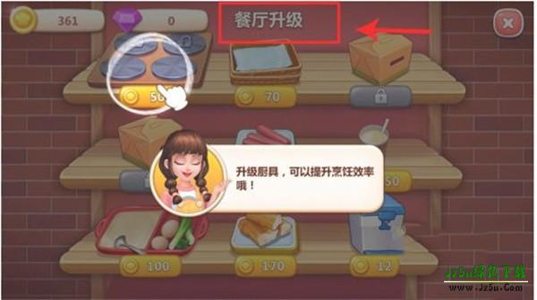 5、其中还可以进行【餐厅升级】,其中花费金币解锁【煎饼锅】,可以加快食物的制作,【煎饼油纸】可以放更多食物