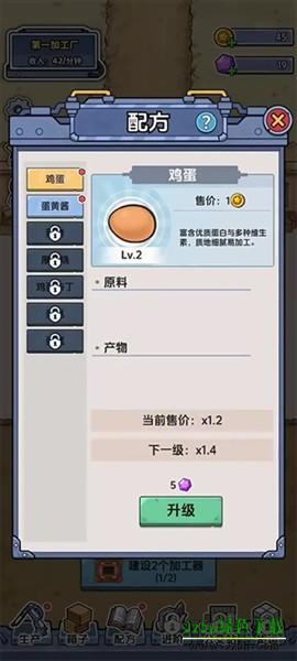 2、经营步入正轨后,您可以点击升级按钮,遵循“谷物分拣→蛋品包装→熟食产线”的科技树进行发展,逐步解锁更复杂的生产工艺。